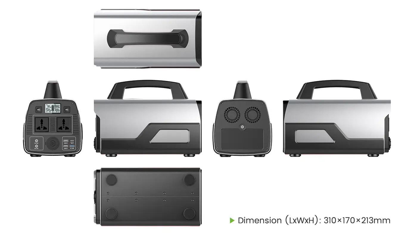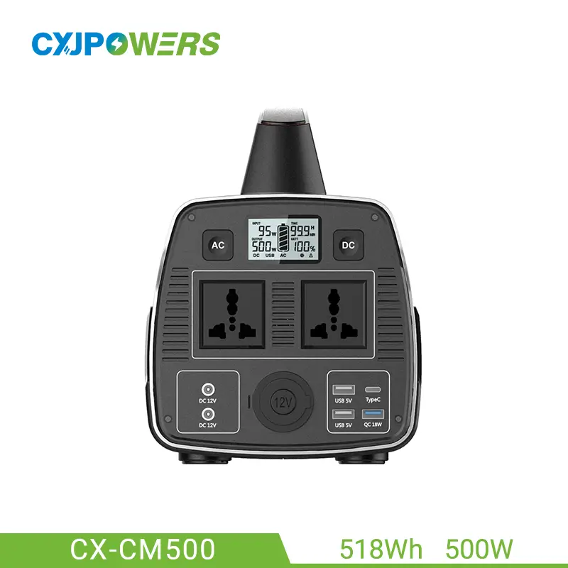CXJPowers portable power station 500W with two AC outlets. AC power outlets are customizable by country. Small and convenient, fully functional, can be carried around. Equipped with AC, DC, USB, PD, cigarette lighter output ports, and LCD display.