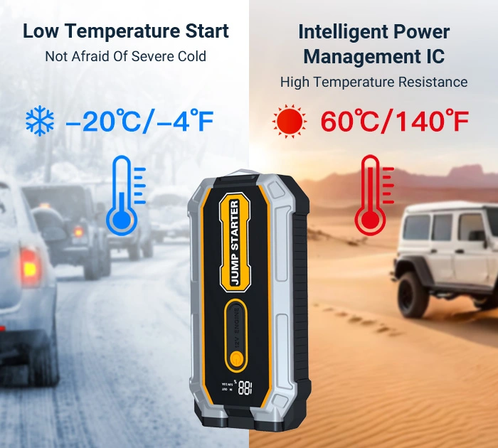 4 in 1 jump starter with power bank, LED light, emergency hammer. Instantly start 12V gasoline cars, SUVs, yachts, motorcycles, diesel cars, snowmobiles, etc.