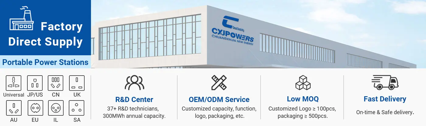 CXJPowers is a professional portable power station factory, focusing on the R&D, manufacturing and sales of 300W to 5500W outdoor camping lithium power stations.